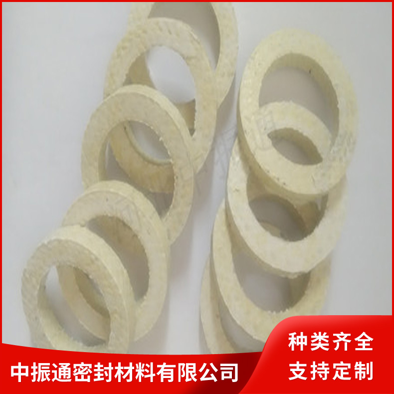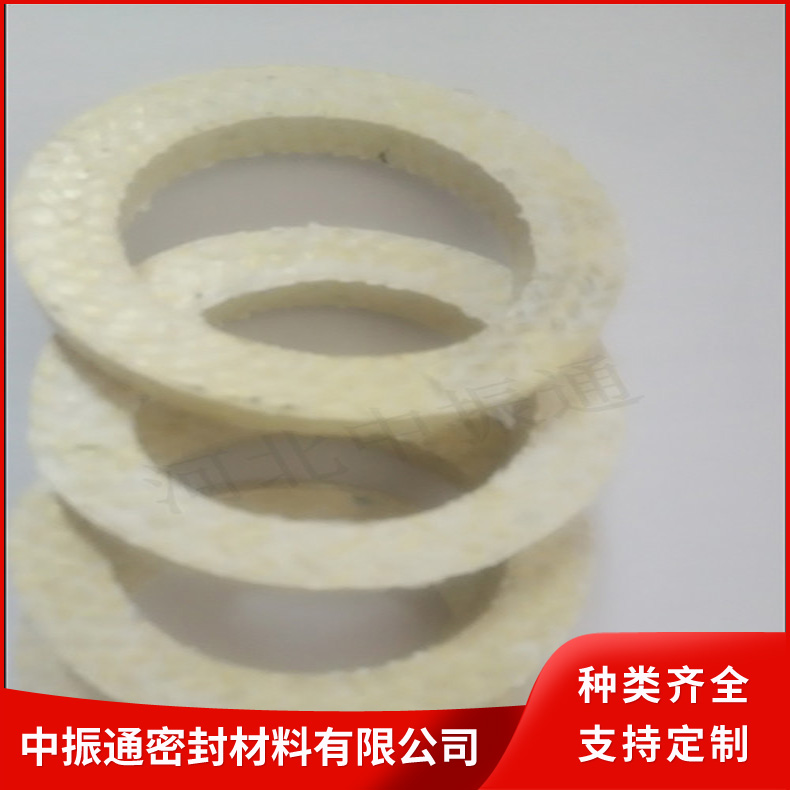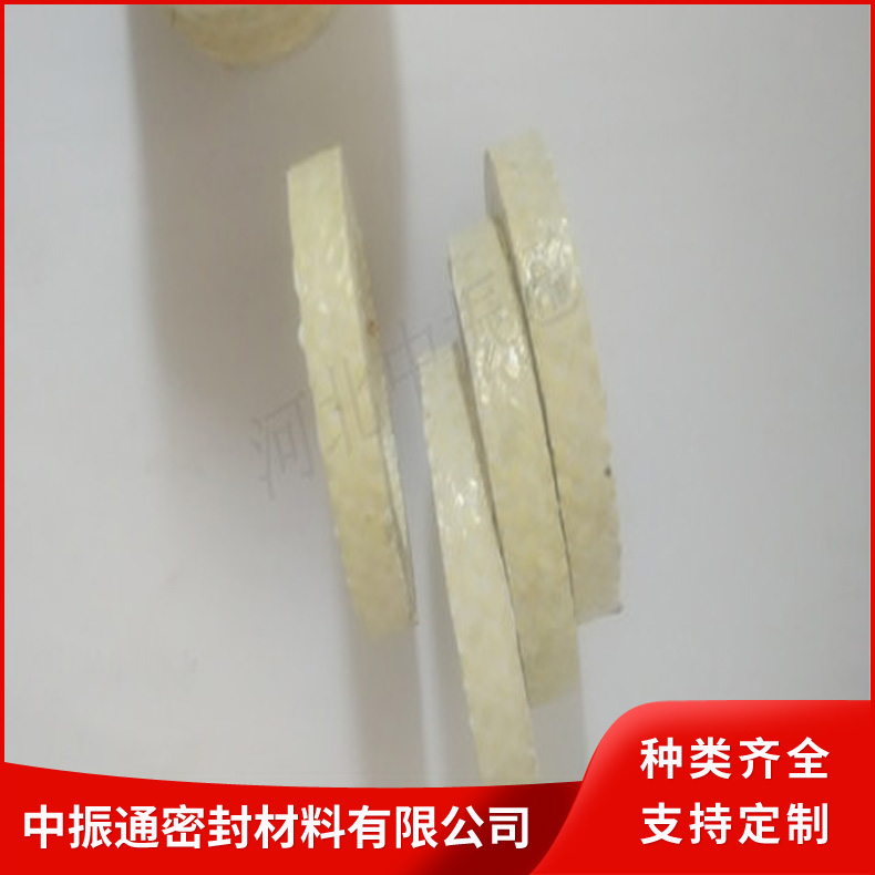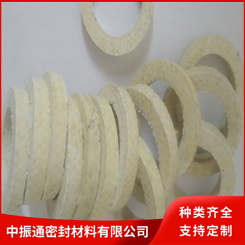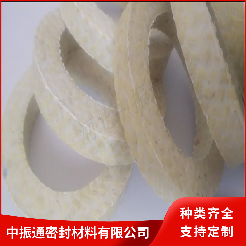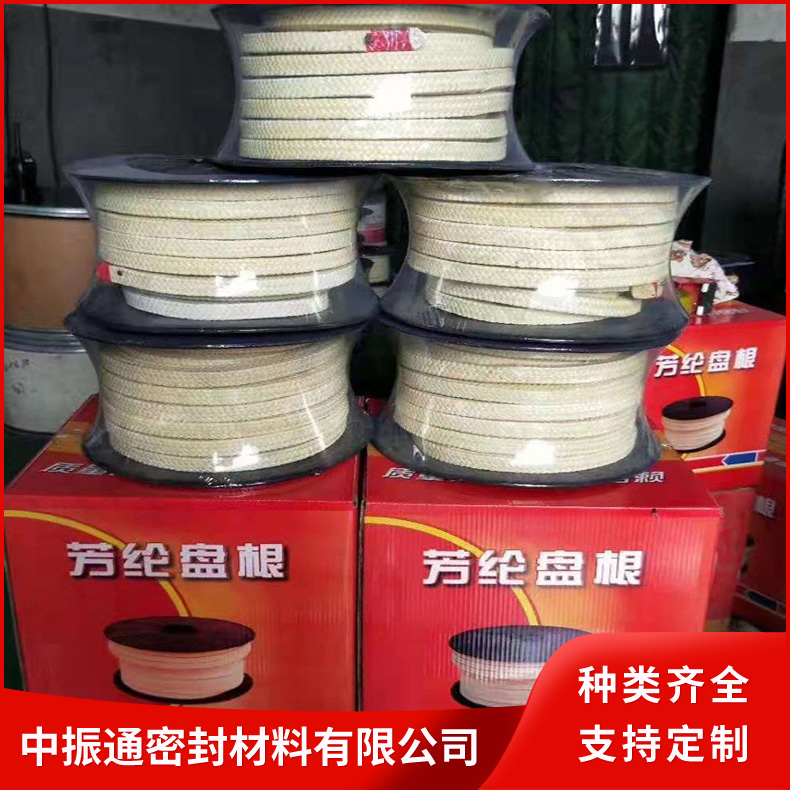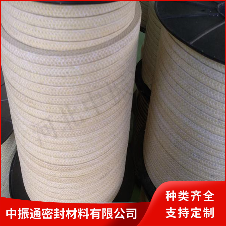 芳纶纤维盘根由芳纶纤维浸渍聚四氟乳液和润滑剂处理编织而成。有较好的耐化学性,高回弹,低冷流。芳纶盘根具有很好的高转速、高模数的性质(被称为人造金属线)。所以,与其它类型的盘根比较,它能抵抗颗粒结晶介质和更高的温度既可单独使用也可与其它盘根组合。在泵系统上是很好的石棉替代产品。