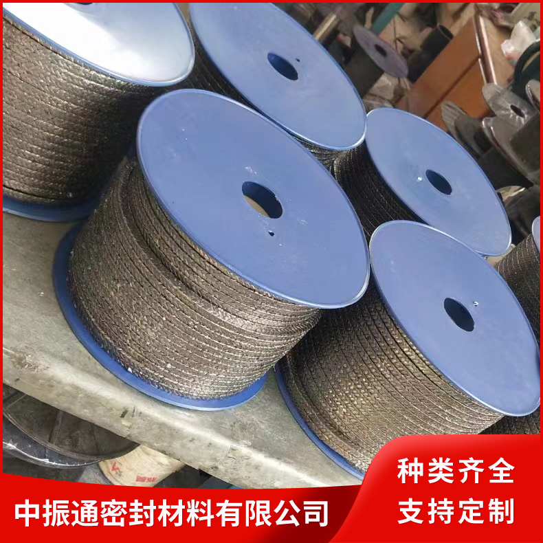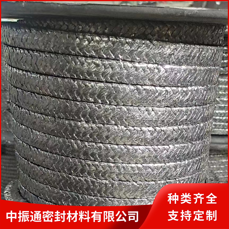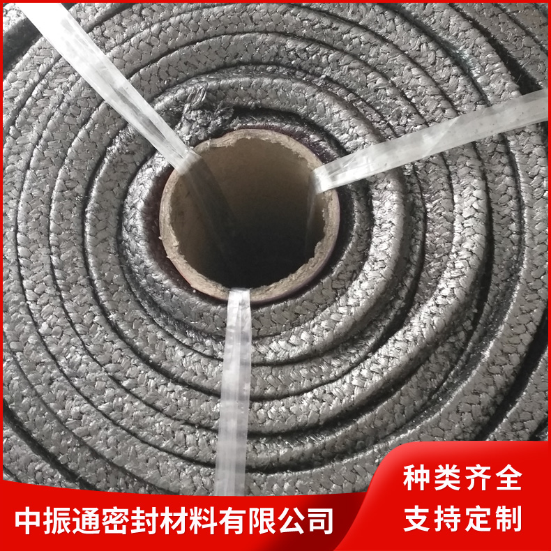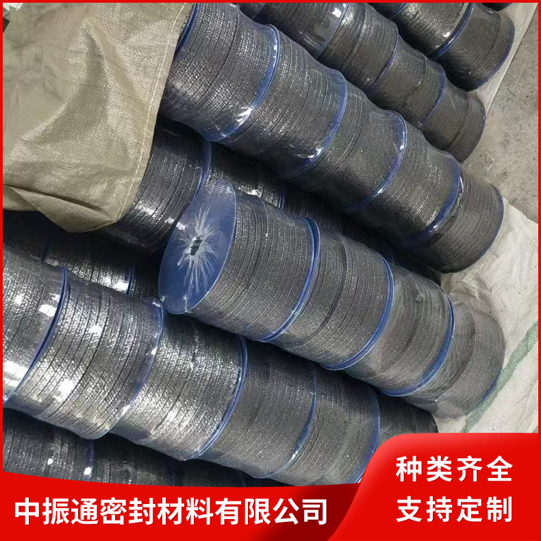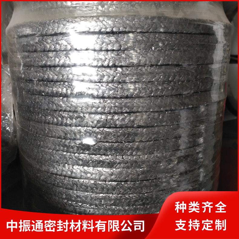 石墨盘根采用玻璃纤维、铜丝、不锈钢丝、镍丝,茵苛镍合金丝等材料增强的纯膨胀石墨线编织而成。具有膨胀石墨的各项特性,而且通用性强,柔软性好,强度高。与一般的编织盘根组合,是解决高温,高压密封难题的更有效的密封元件。
